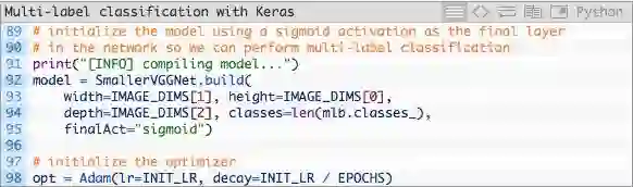 在第92至第95行中,我们构建SmallerVGGNet模型,finalAct=”sigmoid”这个参数指明我们将执行多标签分类。