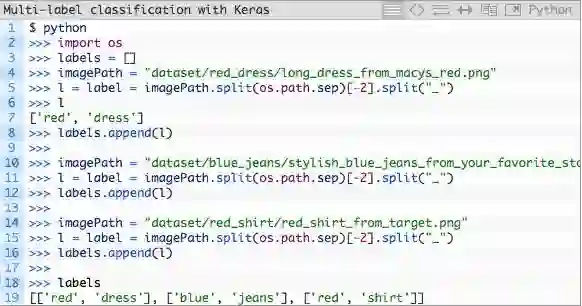 请注意在Python命令行(为了不与train.py中的代码块混淆)中的第17行,有两个分类标签是“hot”(在数组中用一个“1”表示),表明这各个标签的出现。在本例中,“dress”和“red”在数组中是“hot”(第14至第17行)。其他所有标签的值为“0”。