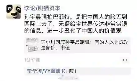 熊猫资本李论也在朋友圈表达了对此事的态度,他表示孙宇晨强拍巴菲特,进一步丑化了中国人的价值观。