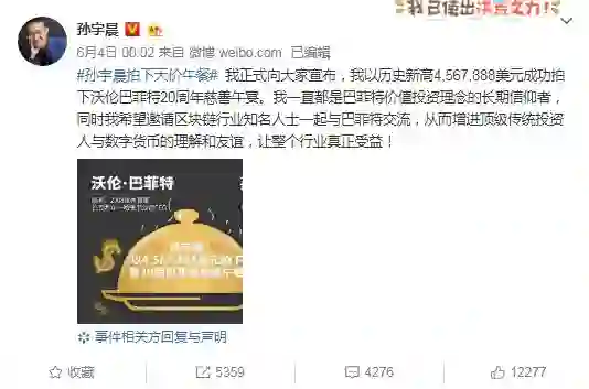 那吃瓜群众们就还是拭目以待,这个头衔长度媲美龙母的男人,新概念王者、波场币创造者、北大杰青、宾大骄傲、杰克马门徒、币圈收割机——孙·真土豪·宇晨与巴菲特的午餐,看看到底是谁当谁的韭菜吧?
