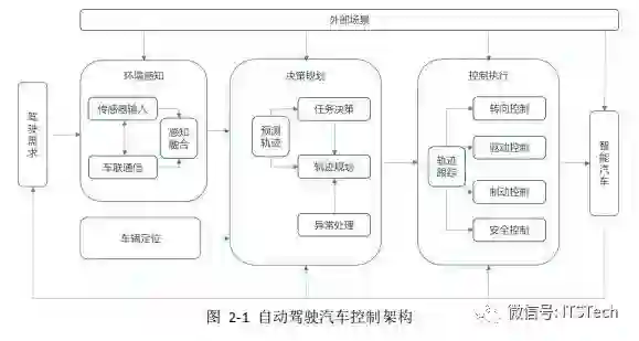 自动驾驶的关键技术是环境感知技术和车辆控制技术,如图 2-1 所示。其中环境感知技术是无人驾驶汽车行驶的基础,车辆控制技术是无人驾驶汽车行驶的核心,包括决策规划和控制执行两个环节,这两项技术相辅相成共同构成自动驾驶汽车的关键技术。自动驾驶的整个流程归结起来有三个部分,首先,是通过雷达、激光雷达、摄像头、车载网联系统等对外界的环境进行感知识别;然后,在融合多方面感知信息的基础上,通过智能算法学习外界场景信息,预测场景中交通参与者的轨迹,规划车辆运行轨迹,实现车辆拟人化控制融入交通流中;第三,跟踪决策规划的轨迹目标,控制车辆的油门、刹车和转向等驾驶动作,调节车辆行驶速度、位置和方向等状态,以保证汽车的安全性、操纵性和稳定性。无论是环境感知技术,还是车辆控制技术,自动驾驶都需要大量的算法支持,而算法研发本来就是个不断迭代的过程,在算法不成熟的条件下,为了配合自动驾驶汽车的功能和性能开发,我们必须遵循从纯模型的仿真,到半实物的仿真,到封闭场地和道路测试,并最终走向开放场地和道路测试这一开发流程。这一流程已经越来越被业内人士所认可。