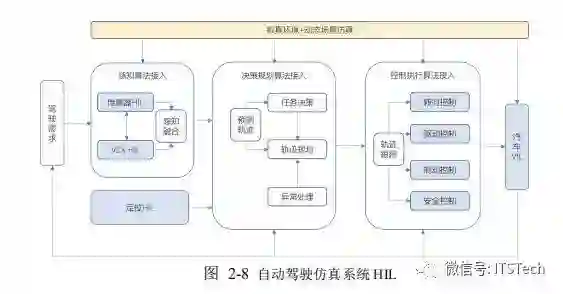 仿真平台除了借助传感器仿真、车辆动力学仿真,通过纯软件的方式接入自动驾驶感知和决策控制系统形成闭环测试之外,集成部分硬件系统的验证测试也是系统开发与验证不可或缺的一部分。通过仿真环境,结合部分硬件系统的计算结果进行测试,可以使软件和硬件的兼容性和功能完整性得以验证,用较低的成本测量验证子系统模块功能安全性,局部子系统的全方位测试验证,可以方便有针对性的达到系统辨识和错误追踪定位的目的。如图 2-8 所示,在自动驾驶仿真系统解耦架构的基础上,作为自动驾驶系统的感知部分,包括摄像头、激光雷达、毫米波雷达、超声波雷达、GPS/IMU、V2X 等,该部分的性能决定了自动驾驶车辆能否适应复杂多变的交通环境。针对不同的传感器,HIL(硬件在环)会根据不同的传感器和环境因素来部署。前面我们提到传感器仿真中的物理信号仿真和原始信号仿真,都与 HIL 相关。