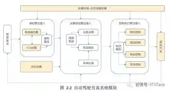 4. 测试:训练好的 CNN 可以实时通过图像输出方向盘角度,可以直观的看出汽车在仿真器道路上的行驶状态。一个完整的自动驾驶仿真平台,需要包括静态场景还原、动态案例仿真、传感器仿真、车辆动力学仿真、并行加速计算等功能,并能够较为容易的接入自动驾驶感知和决策控制系统,如图 2-2 所示。只有算法与仿真平台紧密结合,才能形成一个闭环,达到持续迭代和优化的状态。