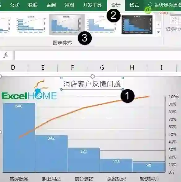选中添加的图表,单击【设计】-【图表样式】,即可改变插入图表的样式。更改图表名称。