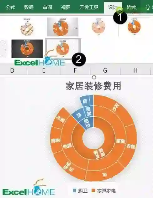 选中插入的图表,单击【设计】-【图表样式】,即可改变插入图表的样式。