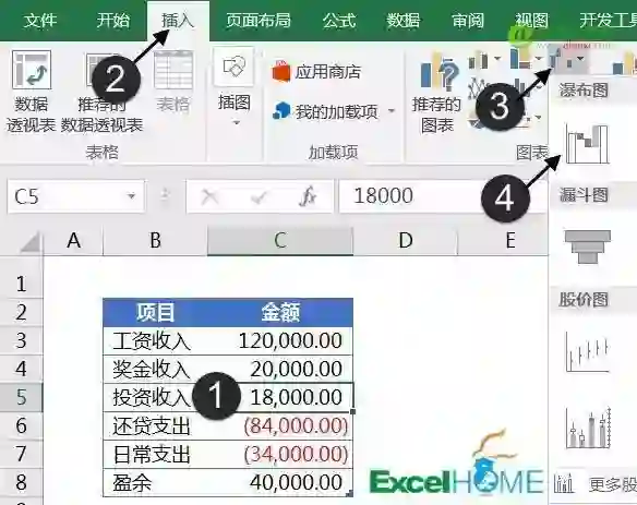 全选表内所有数据,单击【插入】-【瀑布图】。