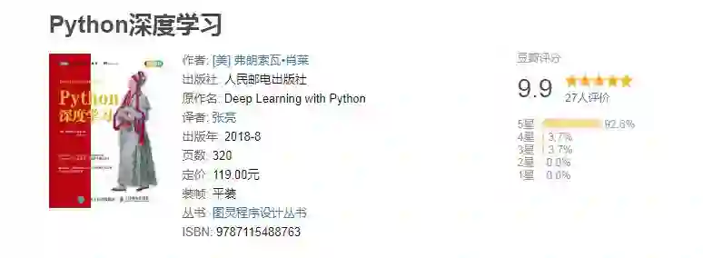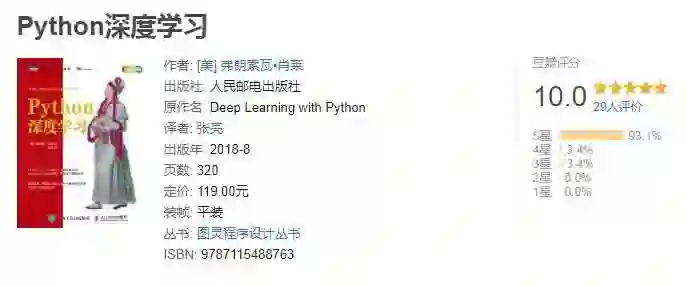 这是一本英文版引进的Python深度学习入门书,英文版书名:Deep Learning with Python,由Keras 之父、Google 人工智能研究员 François Chollet 著作,在豆瓣评分9.4,是亚马逊【语音与音频处理】畅销榜榜首图书。在18年8月份图灵上架了中文版。