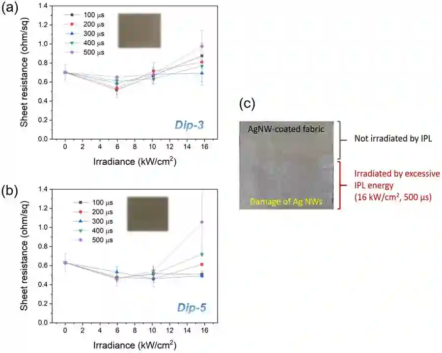 IPL烧结的银纳米线织物的电气特性。不同辐照度和脉冲宽度(a) Dip-3 (b) Dip-5,IPL烧结的银纳米线织物的表面电阻。(c) 银纳米线纤维半暴露在脉冲持续时间 500 µs 、IPL辐照度 6 kW·cm−2 的环境中。(图片来源:参考资料【2】)
