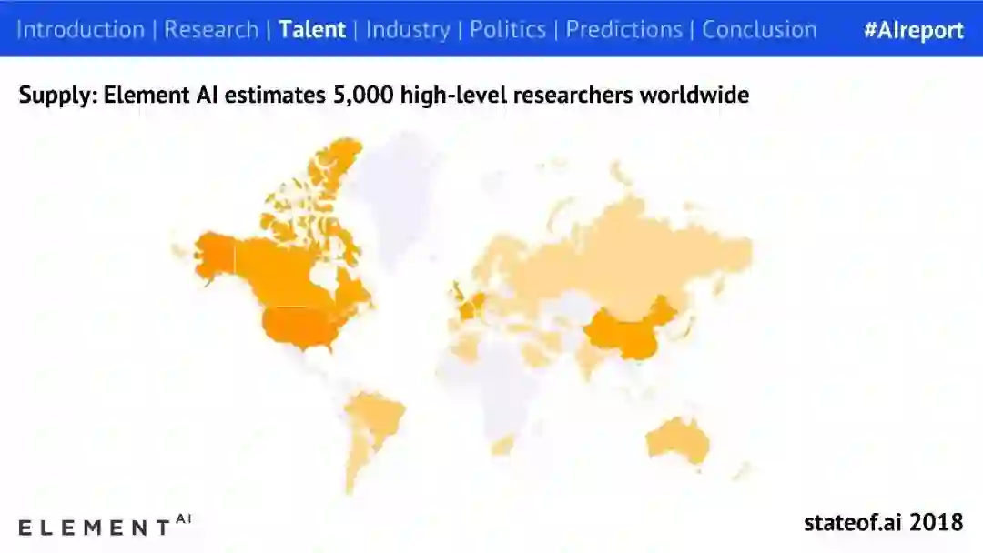 目前,全美人工智能岗位空缺 10k,Element AI 预计全球有 22000 名 AI 研究者和工程师拥有博士学位,预计全球有 5000 名高级 AI 研究者。