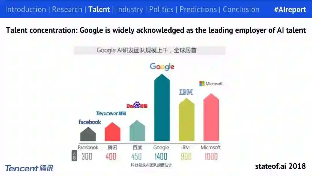 我们都知道,美国是全球人工智能人才的温床,是人才交流最集中的地方。而在众多美国科技公司里,谷歌成为当前最大的 AI 人才雇主。仅次于谷歌的还有微软、IBM、Facebook 等公司,以及国内的百度和腾讯。