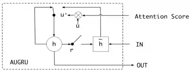 其中,ut' 引入了 at 来取代原有的更新向量 ut,表达的是当前 ut' 对结果的影响。如果当前权重 at 较大,ut' 也较大,当前时刻 ht' 保留更多,上一个时刻 ht-1 影响也会少一点。从而整个 AUGRU 结果可以更平滑的学习用户兴趣。