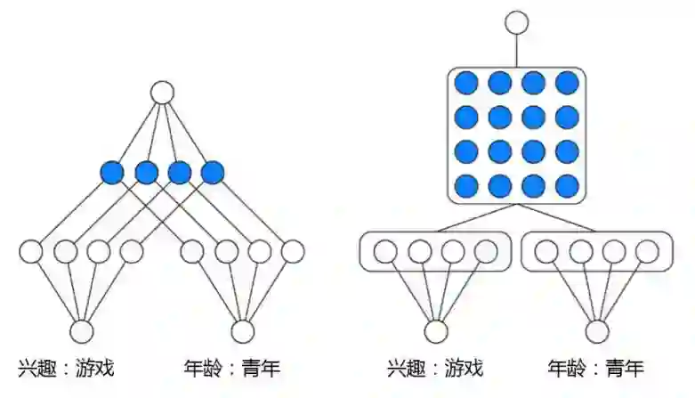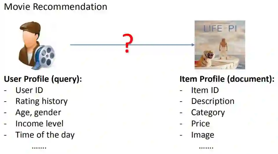 推荐中的两大实体是 user 和 item,两者的表征体系可能完全没有重叠。例如电影推荐系统里,用户的特征描述是:用户 id,用户评分历史、用户性别、年龄;而电影的特征描述是:电影 id,电影描述,电影分类,电影票房等。这就决定了推荐中,user 和 item 的匹配是无法从表面的特征解决两者 gap 的。
