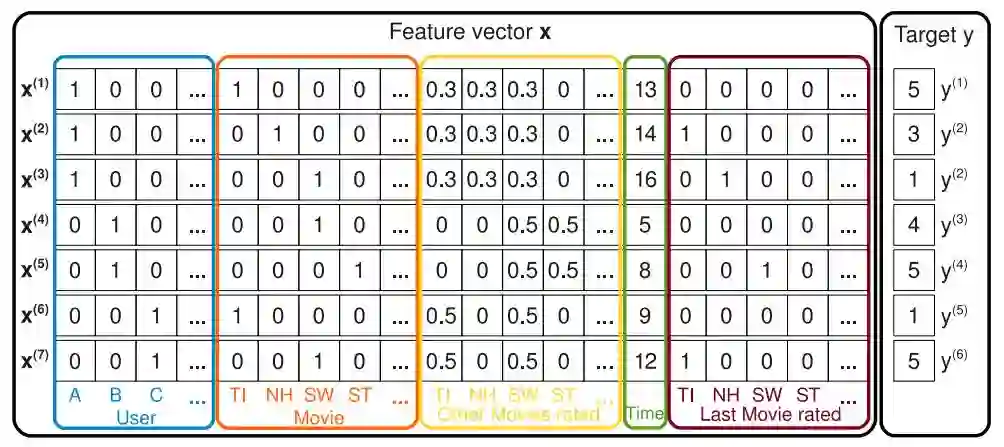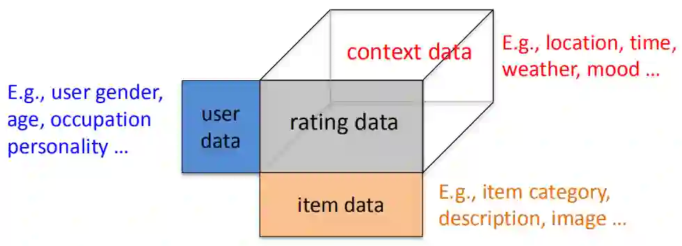 上述的方法中,无论是 CF,MF,SVD,SVD++,还是 FISM,都只是利用了 user 和 item 的交互信息 ( ratin g data ),而对于大量的 side information 信息没有利用到。例如 user 本身的信息,如年龄,性别、职业;item 本身的 side information,如分类,描述,图文信息;以及 context 上下文信息,如位置,时间,天气等。因此,传统模型要讲的第二部分,是如何利用这些特征,去构造 feature-based 的 model。
