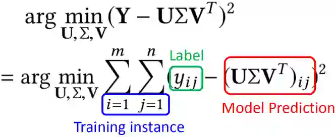 其中 yij 为用户 i 对物品 j 的真实评分,也就是 label,U 和 V 为模型预估值,求解矩阵 U 和 V 的过程就是最小化用户真实评分矩阵和预测矩阵误差的过程。