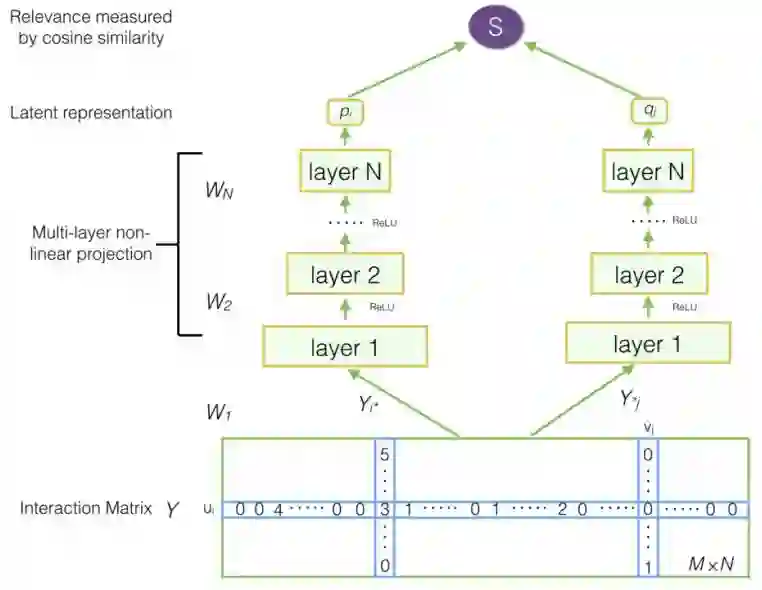 DMF 模型也就是深度矩阵分解模型,在传统的 MF 中增加了 MLP 网络,整个网络框架如图3.3所示。