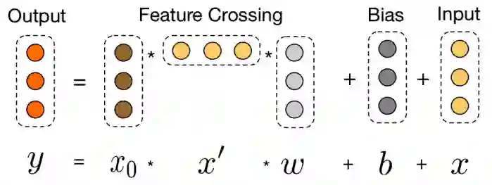 使用多层的 cross 来做特征交叉,对于 cross 网络中每一层的输入都由前一层以及第一层的输入组成,从这个维度上代表的是高阶特征的组合。比如说,第四层网络的输出包含了第三层和第二层的输入;而第三层又包含了第二层和第一层,因此这里就是个3阶的特征交叉。特征的交叉使用的是 bit-wise,也就是每个特征内部 embedding 的 element 也会两两交叉。