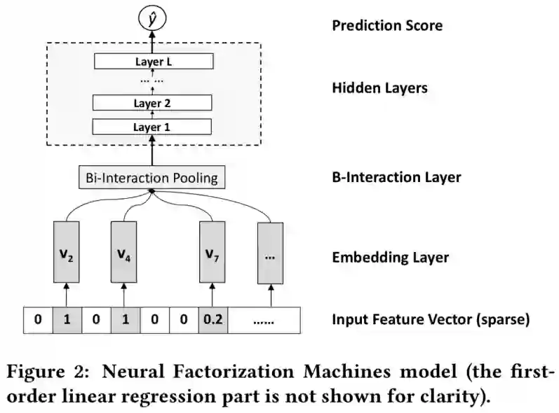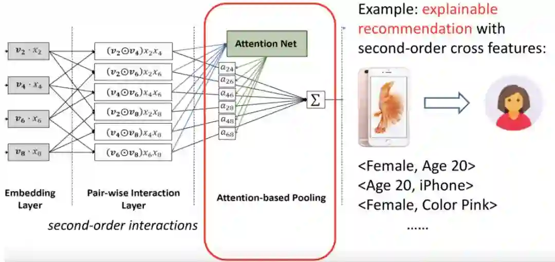 交叉使用的带权重的 bi-interaction,可以理解成所有 vector 的 weight sum pooling,然后使用一个简单的线性模型得到最终的值。