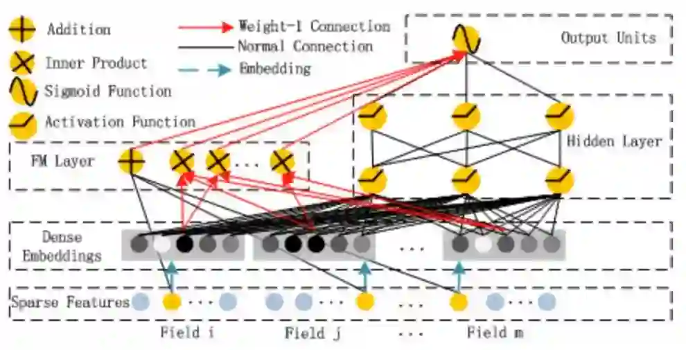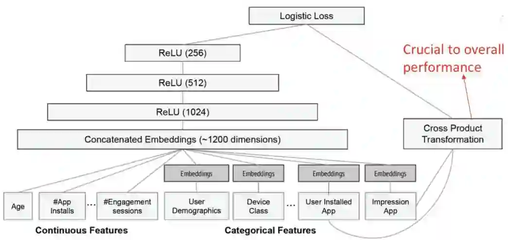 和 wide&deep 最大的不同是 deep 部分引用了 res-net,但个人觉得在目前主流的模型里用的较少。虽然 res-net 理论上可以使用更深的模型提升效果,但在目前工业界大规模稀疏的推荐系统里,还没见到太多往 res-net 方向取得较大进展的工作。