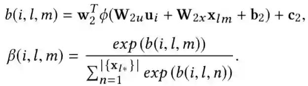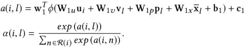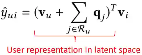 注意到用户表达不再是独立的隐向量,而是用用户喜欢过的所有 item 的累加求和得到作为 user 的表达;而 item 本身的隐向量 vi 是另一套表示,两者最终同样用向量内积表示。