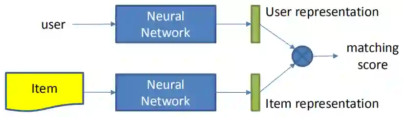 本章主要讲述第一种方法,representation learning,也就是基于表示学习的方法。这种方法会分别学习用户的 representation 以及 item 的 representation,也就是 user 和 item 各自的 embedding 向量 ( 或者也叫做隐向量 ),然后通过定义 matching score 的函数,一般是简单的向量点击、或者 cosine 距离来得到两者的匹配分数。整个 representation learning 的框架如图3.1所示,是个典型的 user 和 item 的双塔结构: