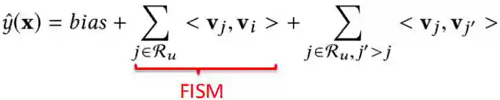 上述提到的两种模型 CF 方法和 MF 方法都只是简单利用了 user-item 的交互信息,对于用户本身的表达是 userid 也就是用户本身。2014年 KDD 上提出了一种更加能够表达用户信息的方法,Factored Item Similarity Model,简称 FISM,顾名思义,就是将用户喜欢过的 item 作为用户的表达来刻画用户,用数据公式表示如下: