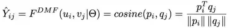 其中,每个用户表达分成两个部分,左边 vu 表示用户 id 映射的隐向量 ( user-based CF 思想 ),右边是用户交互过的 item 集合的求和 ( item-based CF 思想 )。User 和 item 的相似度还是用向量点击来表达。