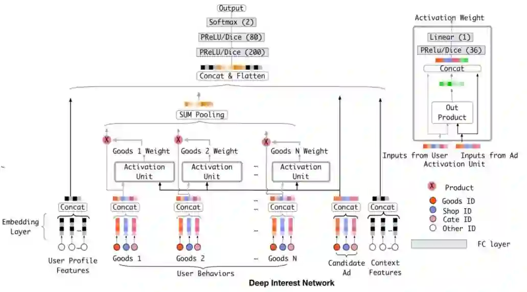 对于每个历史行为 ht,当前候选广告 ea,通过 softmax 求出两者的权重。注意这里不是直接向量点击,而是引入了矩阵 W,可以认为是简单的一层全连接网络。