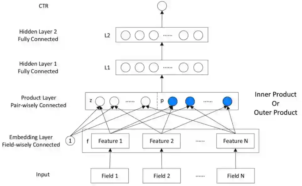 PNN 模型放到基于 FM 的模型是因为本质上和 FM 一样,都是在学习特征的二阶组合。和 deepFM 不同的是,以 IPNN 为例,PNN 的所有特征两两 product 交叉学习得到的值 conat 后得到现实的 product vector 后进入 MLP 模型;而 deepFM 是直接将 FM 模型的 vector 输入到 MLP 模型中。