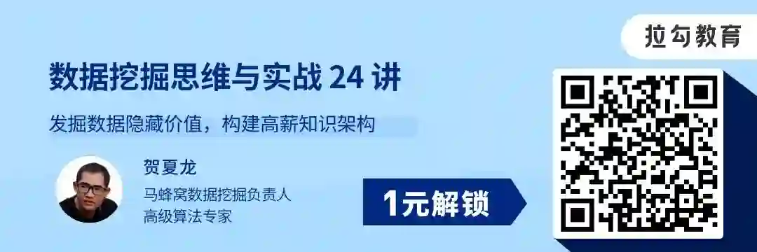 课程最后还有一个彩蛋,专栏的最后会提供数据挖掘的开源工具和学习资源:如果你不会写代码,也可以先使用这些工具来进行数据挖掘;如果你希望在数据挖掘方面有更加深入的学习和理解,那么这些资源也会帮到你。