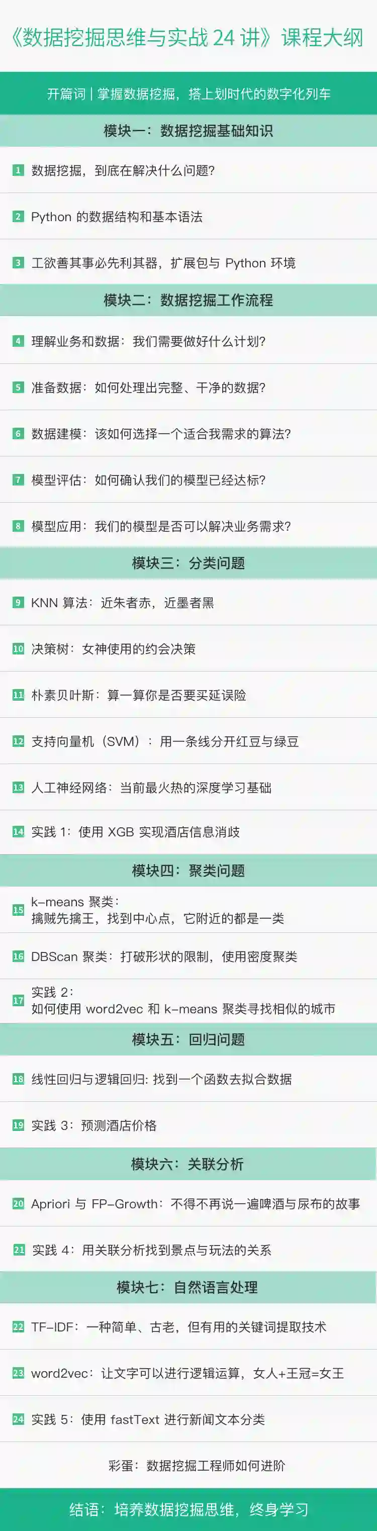 · 算法详解(模块三~模块七)。涉及数据挖掘的分类、聚类、回归、关联分析这四大问题,以及自然语言处理的部分知识。重点介绍每个算法的理念、优缺点、应用场景,配合简短的代码来说明该如何使用,让你能够快速上手应用。每个模块的最后一个课时,都会通过实践案例,为你演示实战中该如何处理具体问题。