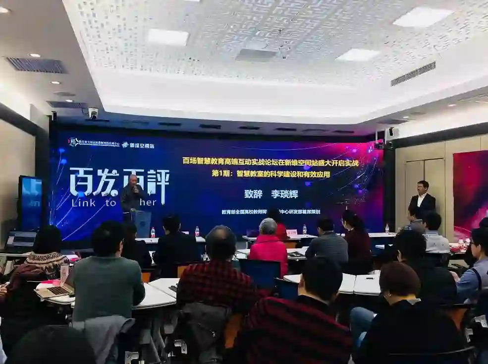 教育部全国高校教师网络培训中心研发部首席策划李琰辉致辞:这期讲座题目《智慧教室的科学建设与有效应用》,主会场放在了北京中关村互联网教育创新中心“新维空间站”。新维空间站,是用了未来教育理念建设的未来教室。大家现在应该能看到,我身边这个很炫的高清大屏,场地设备非常好,充满了时代感和科技感,这和今天的主题很应景。感谢新维空间站和新界教育对本次活动的大力支持,也欢迎主会场来自各个高校和企业界、媒体界的朋友们,欢迎你们!