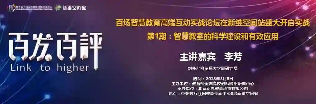 【百发百评】新维智慧教育高端实战论坛,由“移动学习”教育部-中国移动联合实验室MOOC研究中心发起,内容涵盖100场智慧教育时代教师发展、100场基于大数据的教育教学质量评价、100场智慧学习场景建设与导用、100场区块链+教育应用等研究与实践领域。论坛将陆续推出多维度、立体式的互动交流活动,依托MOOC中心研发的高端智慧教育新维空间站和MOOC知名公众号,邀请国际、国内知名教育、信息技术和行业应用专家,实现现场分享交流、异地实时并班互动、云端在线社群学习,旨在打造场景精品,打通国际环境,引领教师发展、大数据评测评估、智慧教室应用及区块链+教育等发展前沿,回归教育初心,创新教育框架,形成未来教育新生态。
