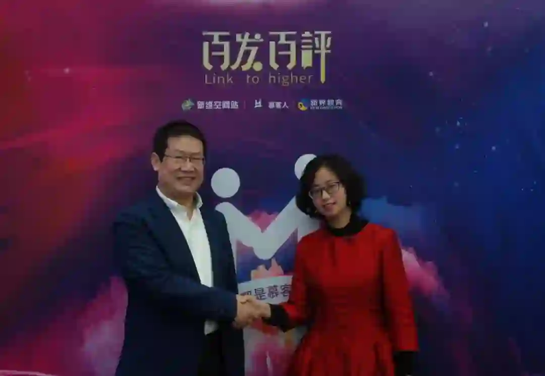 王涛博士与主讲嘉宾李芳老师在【百发百评】文化展示墙前合影,并高呼“我们都是慕客人,我们都是教发人!”的口号!