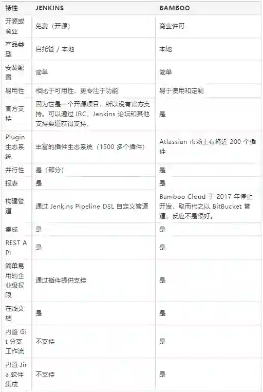 以下是 Bamboo 和 Jenkins 的对比快照: