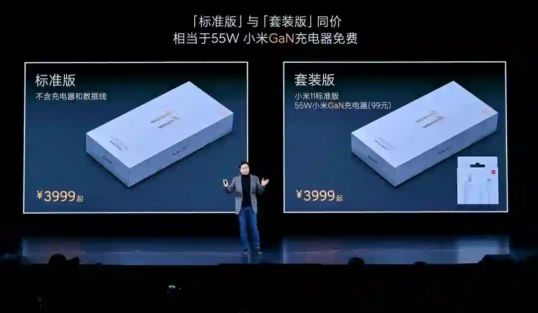 小米11此次会提供两种包装版本,一个是环保的标准版,不含充电器和数据线,另一个是套装版,带有价值99元的55W氮化镓充电器和数据,但价格完全相同。