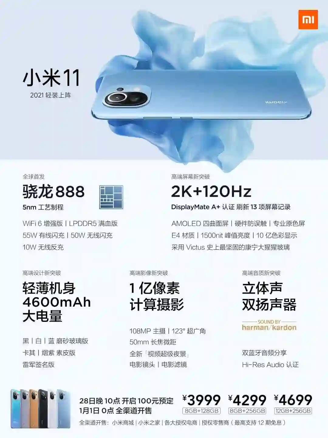 最后就是价格,不忘初心的小米11保持了与小米10相同的起售价,8GB+128GB版本售价3999元,8GB+256GB版本售价4299元,12GB+256GB版本售价4699元,今晚开启100元订金预售,1月1日首销,支持12期免息购买。