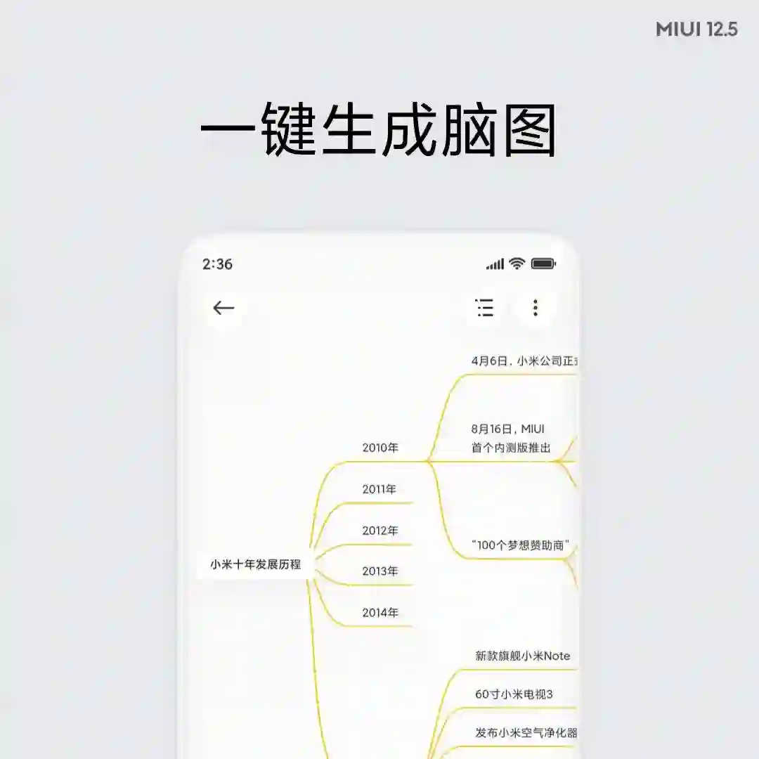 不止如此,MIUI12.5还有应用的升级。首先是之前的便签升级为MIUI笔记:思维笔记功能,实现轻松书写、便捷管理和自由拖拽等操作,还能一键生成脑图;涂鸦功能,精心调校四种画笔,细腻还原真实笔触,能自动规整图形与连接线条;全新速记窗口,能开启全局「摘录」,文字、链接、图片和文章能自动摘录进笔记里;全新排版系统,会以动态网格来对用户的文字进行精美排版。
