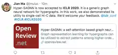 CMU计算机学院副教授马坚表示,自己组的Hyper-SAGNN论文现在已被ICLR 2020接受。这是一种用于超图的通用图神经网络。在这项工作中,他们还展示了其对单细胞Hi-C数据的实用性。
