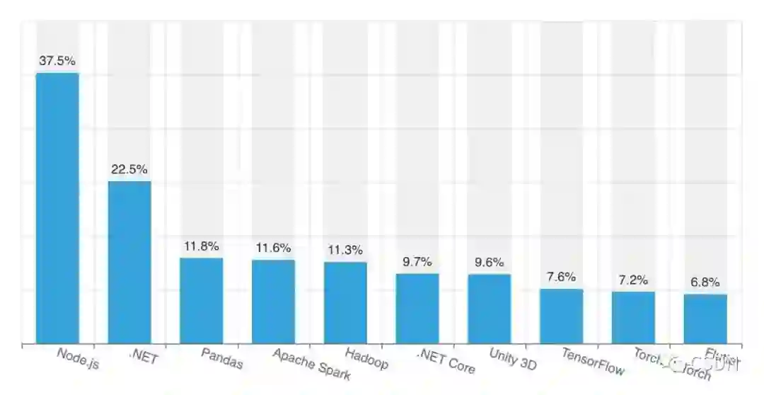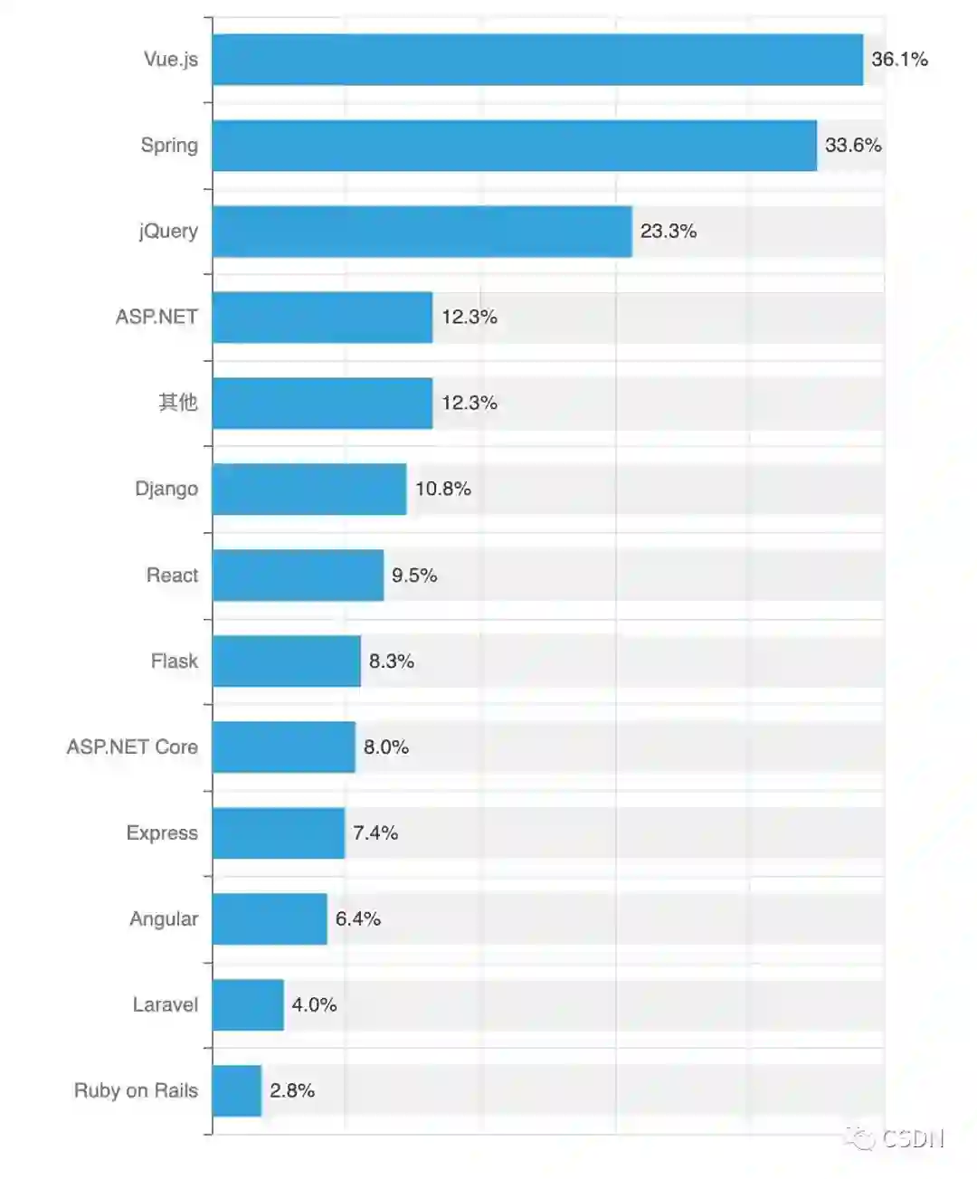 近年来,Vue.js 在 Web 框架中愈发流行。数据显示,有 36.1% 的开发者用 Vue.js 进行了大量开发。相较之下,jQuery 的使用量则在逐年下降,由去年的 29.1% 降至了 23.3%。