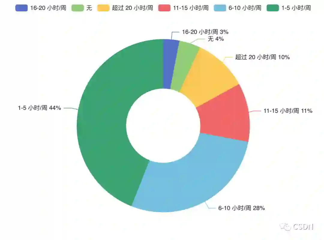 工作之余的闲暇时光是不少开发者提升自我的重要时间段,仅有 4% 的开发者表示没有时间去充电学习,而 44% 的受访者则表示每周会学习 1-5 小时。