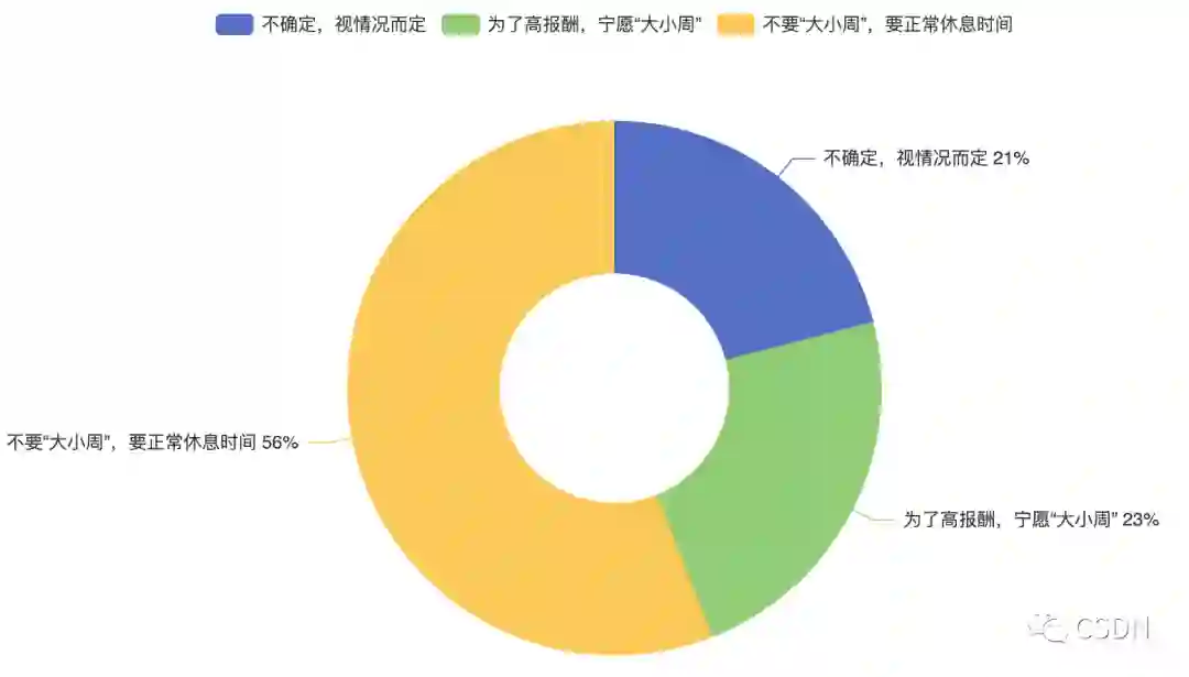 对于大部分程序员来说,舒适的工时总是很难匹配到理想的高薪,因此对于“大小周”的态度,他们也分成了两个阵营:23% 的开发者表示,虽然大小周会占用周末休息时间,但为了高薪宁愿“大小周”;56% 的开发者则选择更轻松的生活方式,不要“大小周”。
