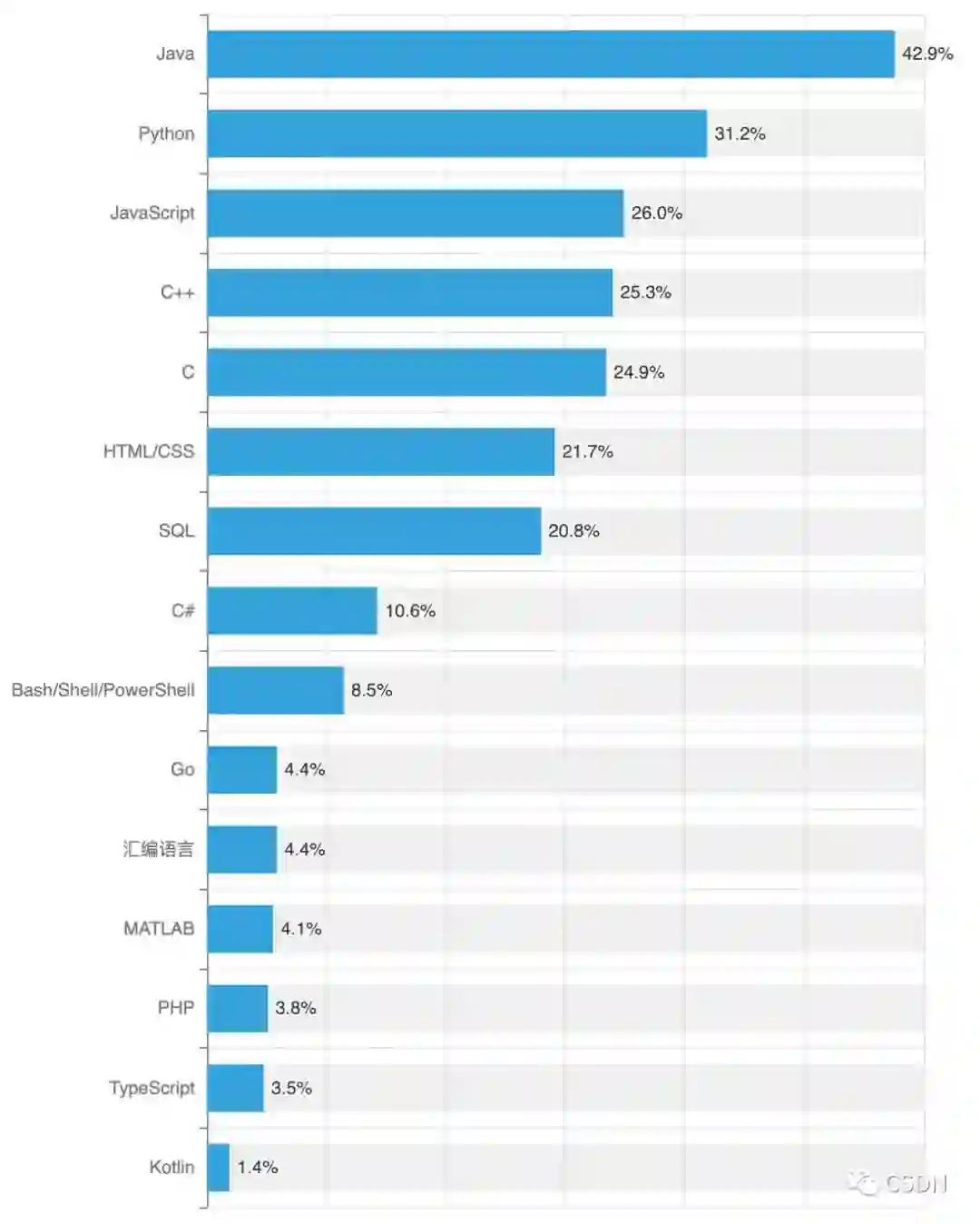 对程序员而言息息相关的编程语言方面,国内使用 Java 的开发者人数依旧稳居第一,近来长期占据 TIOBE 榜单第一的 Python,则以 31.2% 的占比高居第二。另外,Python 也是 25.3% 的开发者想要学习的下一门编程语言——可见随着人工智能的发展,Python 的使用量正在逐渐提升,其在开发者圈子也非常受欢迎。