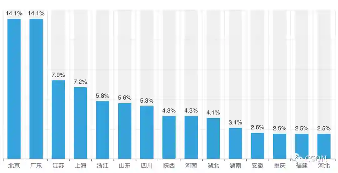 尽管整体收入水平稍有下降,但身在北上广的程序员们薪资依旧可观。月薪高于 1.7 万元的开发者中近 3 成(26%)在北京工作,广东、上海地区月薪高于 1.7 万元的开发者也分别占比 19% 和 14%。另外,调查数据显示 ,月薪高于 1.7 万元开发者数量 TOP 10 的各地区中,在北京和上海工作的开发者有近半数的月薪在 1.7 万元以上,而其它地区仅占三成左右。