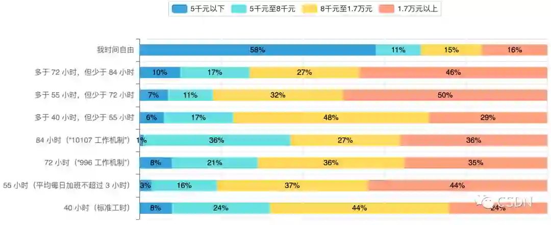 事实证明,程序员“高薪”Tag 的背后,很大程度上可能与加班费有关。在每周工作 40 小时(标准工时)的开发者中,月薪在 1.7 万元以上的仅占 24%。反观每周工作时长超过 55 小时的,拿到高薪的占比会更高。此外,2022 年严峻的行业形势、疫情等因素对自由职业者造成了不小的影响:该群体收入超过 1.7 万元的比例,从去年的 24% 下降至 16%。