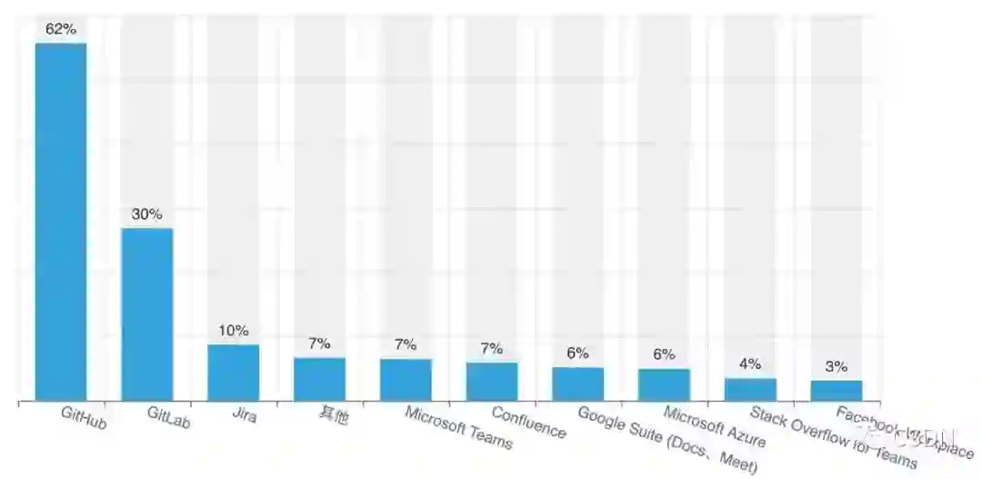 协作也是开发者开发工作中最重要的一环。值得一提的是,今年 1 月 GitHub 在官方博客中宣布达成 1 亿用户,即如今正式有超过 1 亿开发者在使用 GitHub 来构建、维护和贡献软件项目——这项成就也在本次调查结果中得到体现:有 62% 的开发者使用 Github 作为研发协作管理工具,其次是占比 30% 的 GitLab。