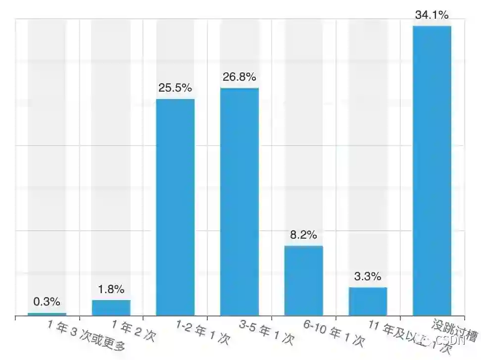 2022 年整体就业形势的改变,使得开发者的工作状态也发生了些许变化。在外界来看人员流动较快的 IT 行业,其 2022 年开发者的跳槽频率略有下降,近 1-2 年内有跳槽经历的人不足三成。