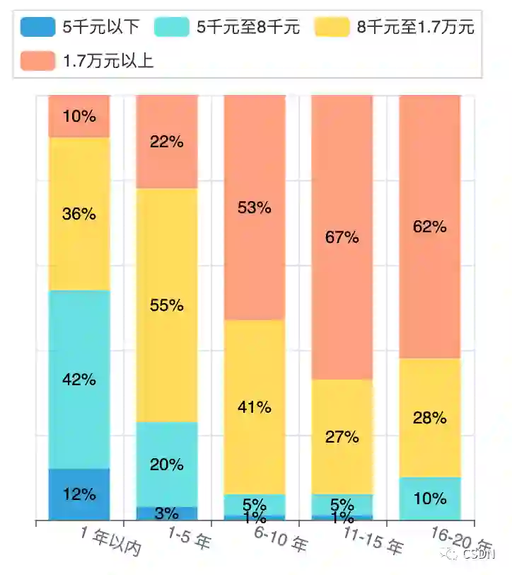 除此之外,程序员的薪资水平也与学历和工龄有关: