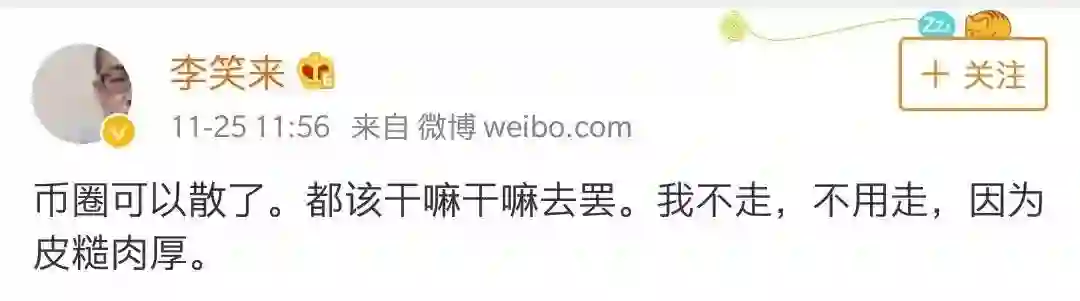 昨日,李笑来在微博表示:“币圈可以散了。都该干嘛干嘛去罢。我不走,不用走,因为皮糙肉厚。”