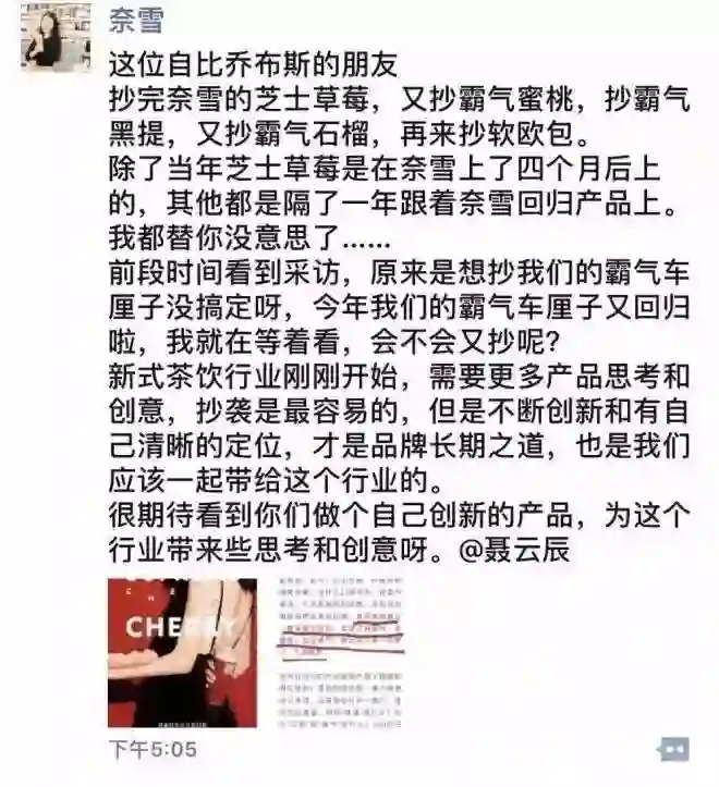 喜茶此前表示本想上新一款车厘子茶饮但没成功,而那是喜茶曾经的产品。因此,奈雪の茶的创始人彭心发朋友圈称,“原来是想抄我们的霸气车厘子没搞定呀。”彭心表示,新式茶饮行需要更多产品思考和创意,抄袭最容易。喜茶创始人聂云辰回复称,真正创新的困难是要去发现裂缝与不足并提供更好的东西,“如果按你这个理解那基本上喜茶每天都可以说别人在‘抄袭’自己”。