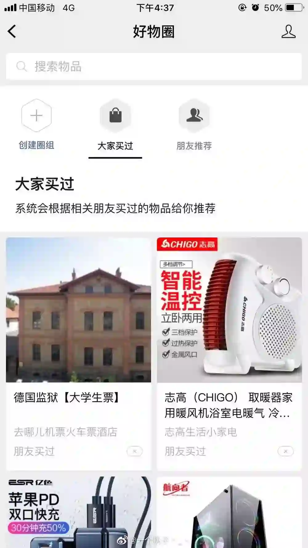 惹了祸的,是最近刚开始测试的“大家买过”功能,页面里可以以不记名的方式查看自己的好友最近都购买了什么。从某种角度来说,跟此前上线的“看一看”功能类似,都是鼓励用户将自己的接触的内容或商品分享出去。只不过到了好物圈这里,不主动分享的话微信就会匿名帮你分享出去。